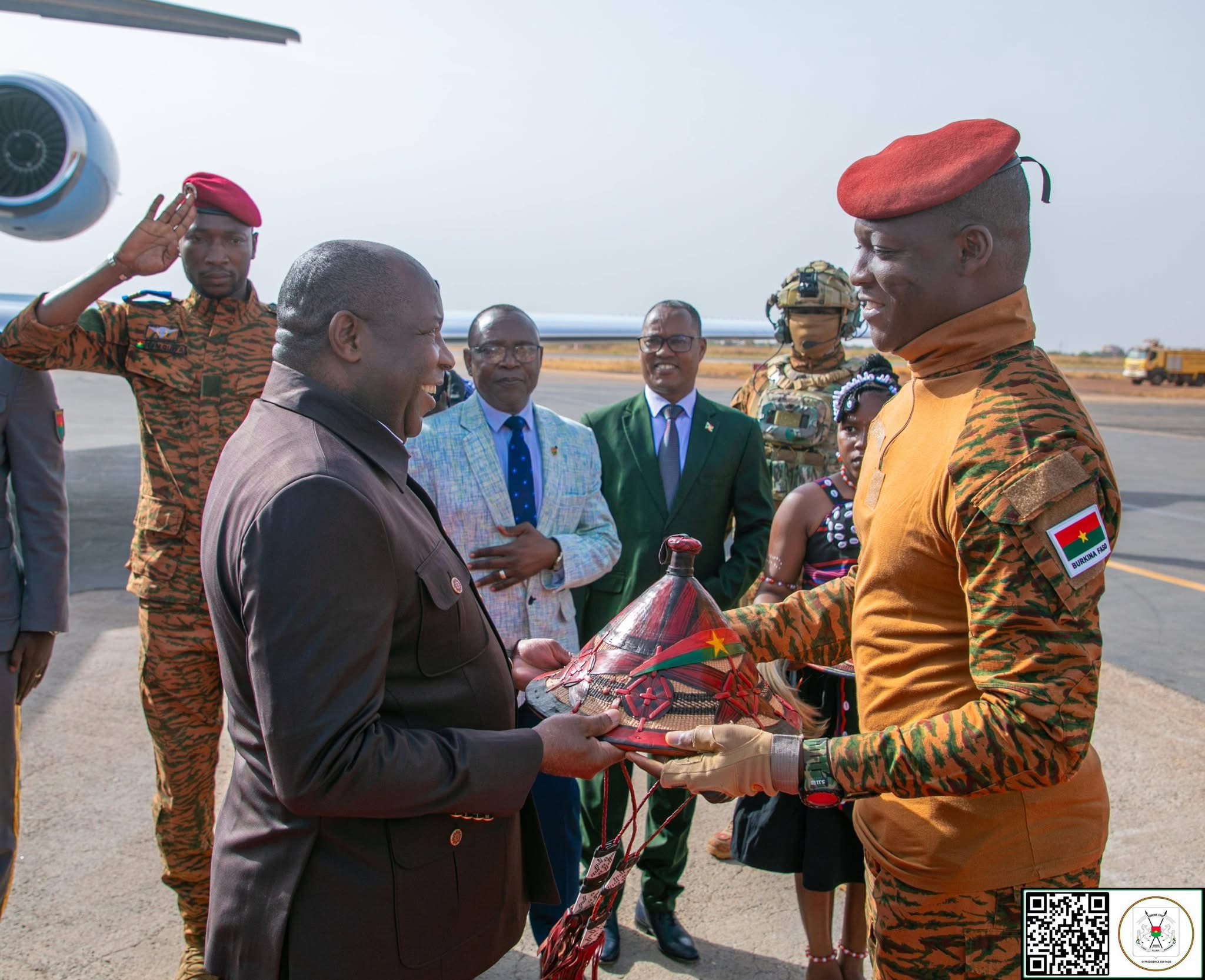 Le Capitaine Ibrahim TRAORÉ, Président du Faso, Président de la Confédération des États du Sahel (AES), a accueilli ce lundi matin à l’Aéroport international de Ouagadougou, le Président en exercice de l’Union Africaine (UA), Son Excellence le Général Évariste NDAYISHIMIYE, Président de la République du Burundi.